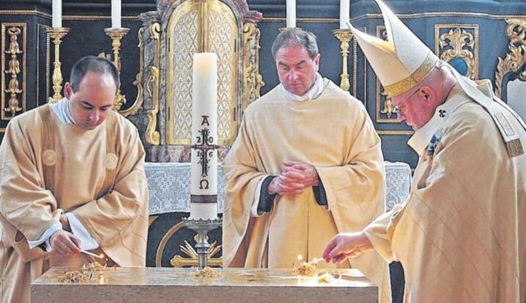 Die Weihe des Altars geschah dann durch die erste Eucharistie. Traditionell bei einer Altarweihe üblich besprengte Kardinal Reinhard Marx den Altar mit Weihwasser und salbte ihn mit Öl. Im Nachgang wurde Weihrauch auf dem Altar verbrannt und das Weihegebet gesprochen.