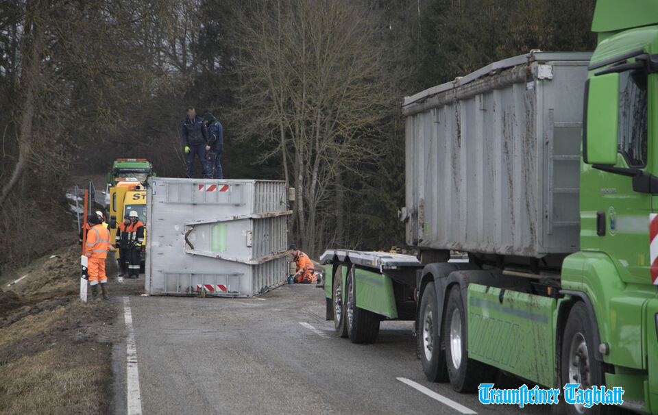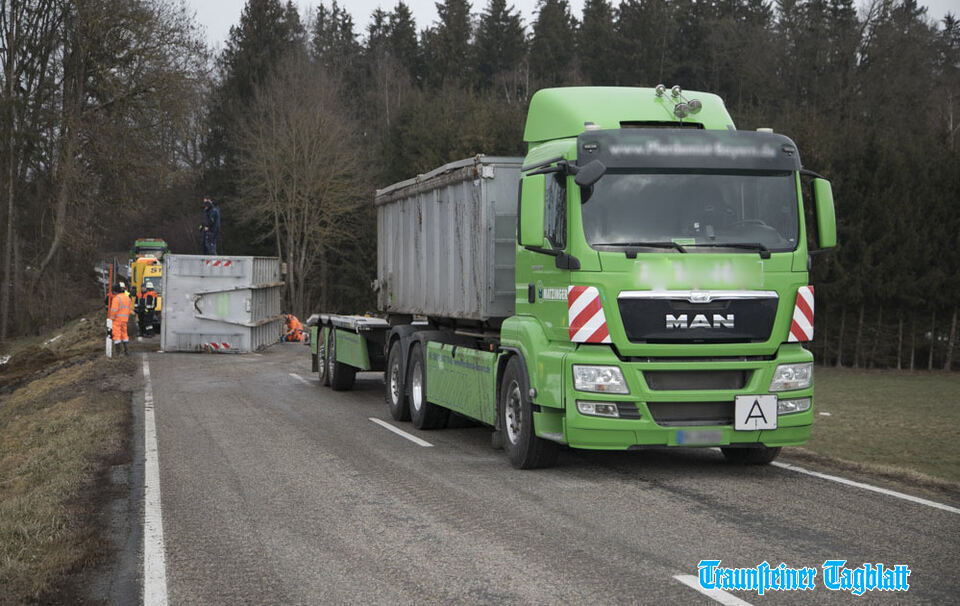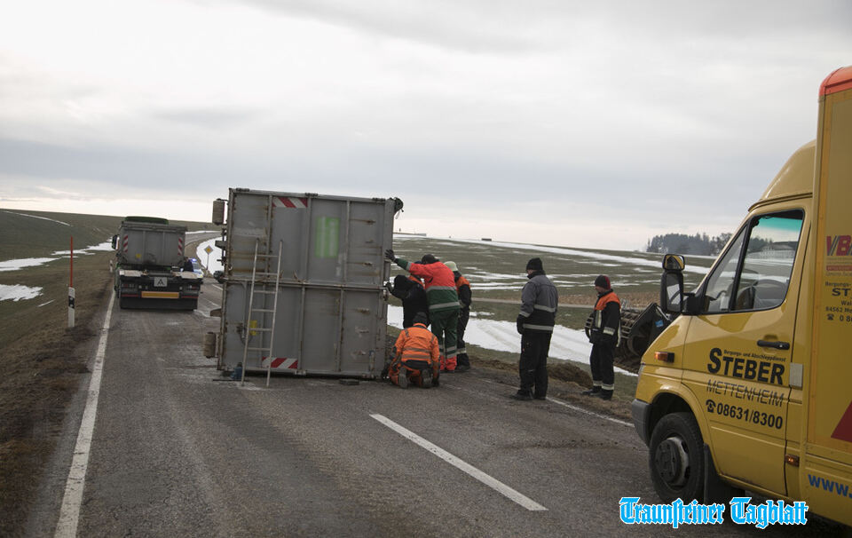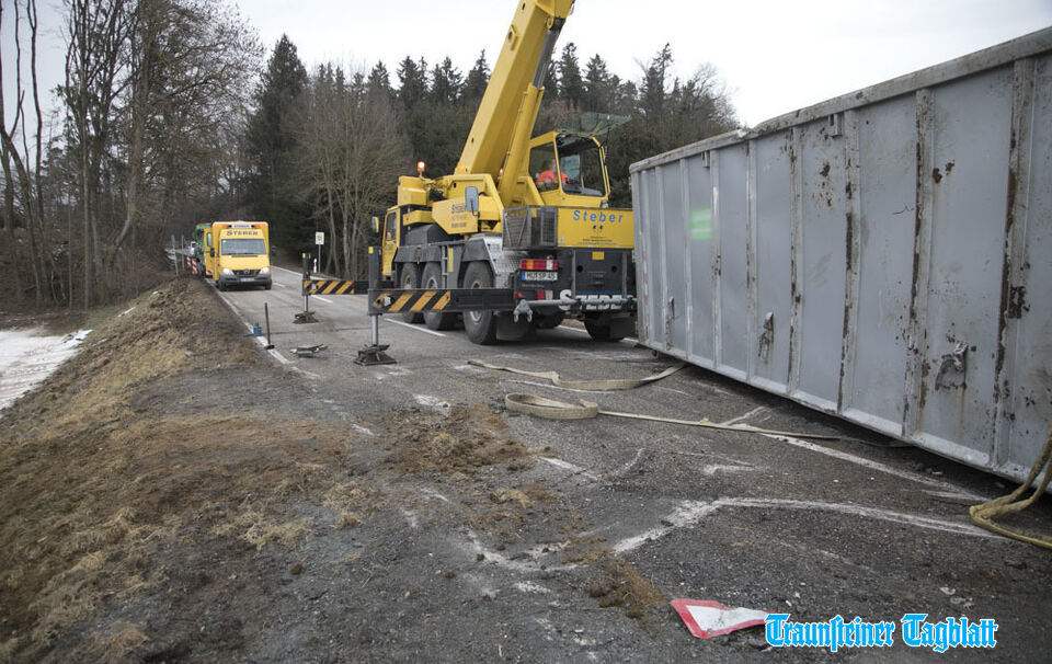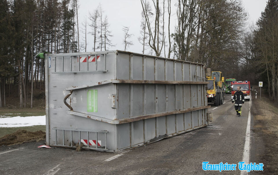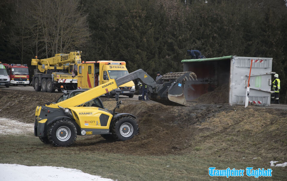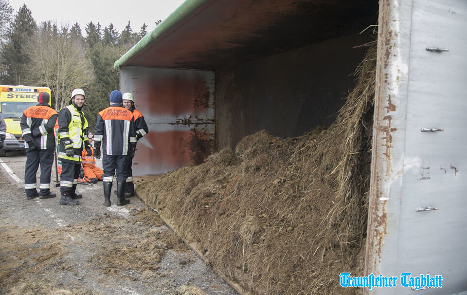 Lkw-Anhänger mit Pferdemist kippt bei Peterskirchen um