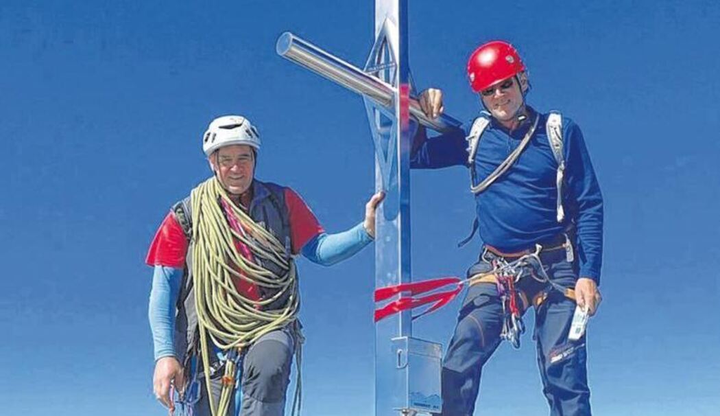 Fritz warf eine Seilschlinge hinauf, dann ging's mit Zug von oben weiter. Vorsichtig tasteten wir uns über eine abenteuerlich anmutende, absturzbereite Felsplatte zur nächsten Wandstelle. Auch ein daumenbreites Gratstück kam vor. Fritz balancierte wie ein Hochseilartist aufrecht darüber hinweg, ich bewältigte ihn lieber rittlings. Der Gipfel mit dem Edelstahl-Designer-Kreuz ist so winzig, dass wir zu zweit gerade sitzen konnten.
