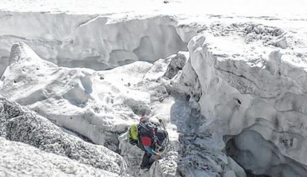 Unser Südgrat-Anstieg war großartig. Hinunter geht’s mit 8 mal 30 Meter Abseilen an eingerichteten Zackenschlingen über die Platten der EngländerRoute nach Westen. Der Normalweg über die SO-Rinne ist wohl einfacher, aber vermutlich recht brüchig. Die Gletscher sehen arg mitgenommen aus. Die vormals mit einem großen Schritt zu übersteigende Randkluft gibt es nicht mehr. Zuletzt seilten wir uns mit den Steigeisen an den Schuhen überhängend in den höllenartig anmutenden Bergschrund hinein, gelangten dann aber über eine Schneebrücke ohne Probleme auf den blanken Gletscher. Er ist dünn und klein geworden. Wir hatten ihn weit mächtiger in Erinnerung.