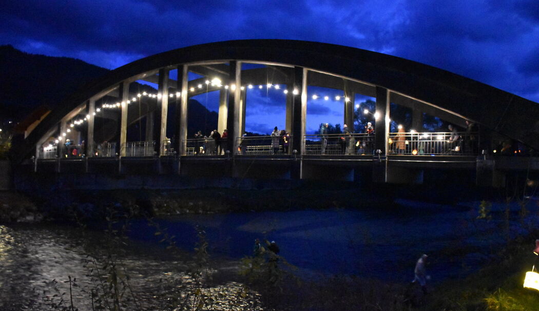 Der lange Zug mit den Kindern, Eltern, Großeltern, Kinderwagen und Hunden mit leuchtenden Halsbändern setzte sich bei einbrechender Dunkelheit in Bewegung. Es ging in zwei Wegen diesseits und jenseits der Ache zwischen der alten Brücke und der Fußgängerbrücke entlang. Die Brücken waren mit vielen Lichtern geschmückt, auf der Achen ließen die Helfer ebenfalls Lichter schwimmen und selbst die