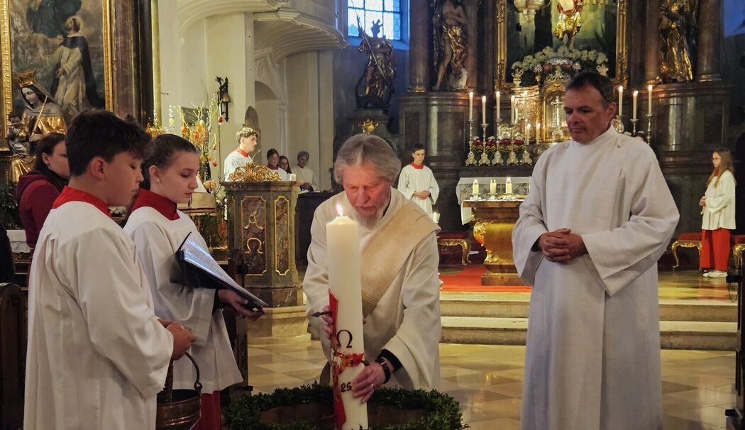 Diakon Robert Rehrl trug die Osterkerze in die dunkle Kirche. Das Licht der Osterkerze wurde dort an die Gläubigen verteilt. Viele hatten Osterkörbchen mit Speisen zur Segnung mitgebracht. In der nur durch Kerzen erleuchteten Kirche trug Diakon Rehrl den Osterhymnus vor, in dem die Auferstehung Jesu als Sieg des Lebens über den Tod besungen wird. Nach der Weihe des Taufwassers und der