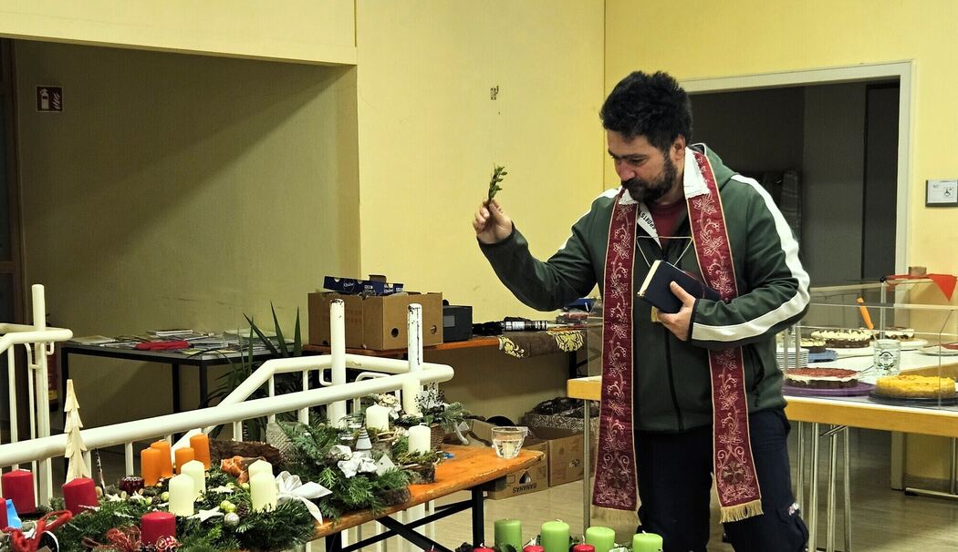 Besucher kamen, um bei der Segnung der beim Eingang und im Foyer aufgereihten Adventskränze und Gestecke dabei zu sein. Pfarrvikar Korbinian Wirzberger segnete nach einem kurzen Gebet die Kränze mit Weihwasser. Den Segen erhielten auch die im Pfarrsaal ausgestellten Krippenfiguren, die die Frauen von der BRK-Bereitschaft in vielen mühevollen Stunden selbst gebastelt hatten.