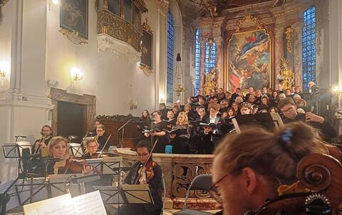 Am Schnittpunkt der beiden gedachten Balken können die drei Werke von Anton Cajetan Adlgasser (1729 bis 1777) als Widmungsträger des Konzerts gelten. Seine dreisätzige Sinfonia in G-Dur für zwei Hörner und Streicher werde seit ihrer Entstehung vermutlich zum ersten Mal wieder aufgeführt, erklärte Musikwissenschaftler Bernhard Kübler in seiner Einführung. Delikate Streicherklänge