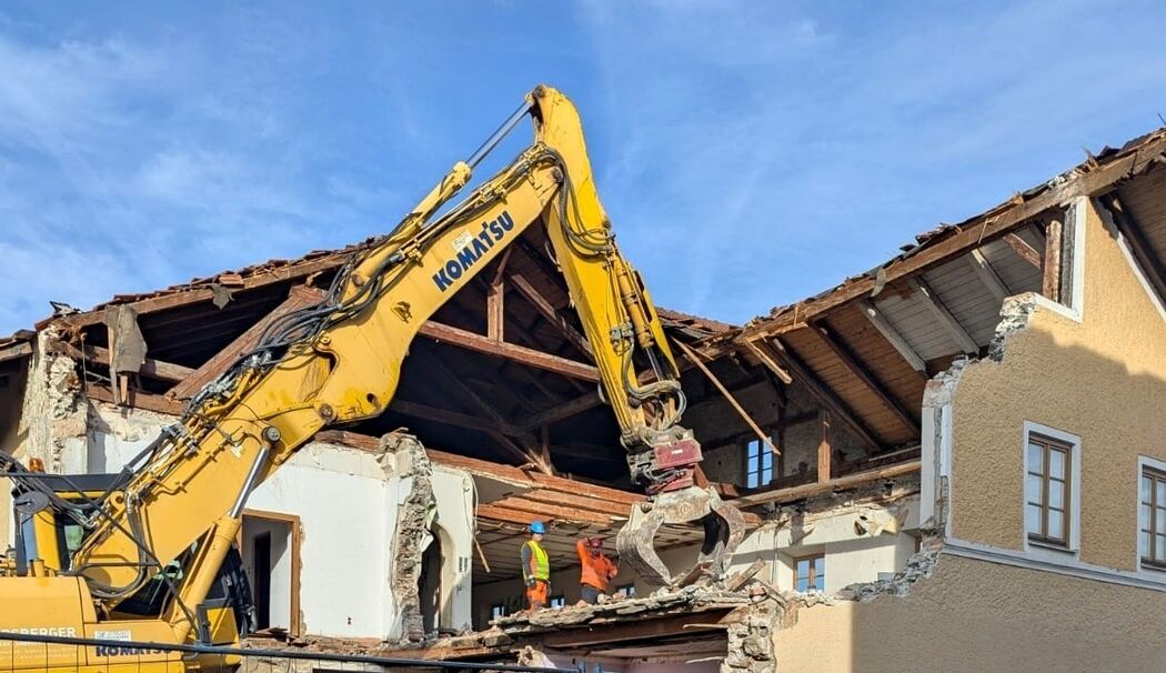 Grabenstätt – Die Abrissarbeiten am früheren Gasthof zur Post haben nun nach einigen Verzögerungen begonnen und werden voraussichtlich in rund zwei Wochen fertig sein. Das seit 2017 leerstehende, ortsbildprägende Gebäude am Marktplatz hatte 2021 die Grassauer Immobilienfirma Wohnlinie GmbH der Rosenheimer Brauerei Flötzinger abgekauft.