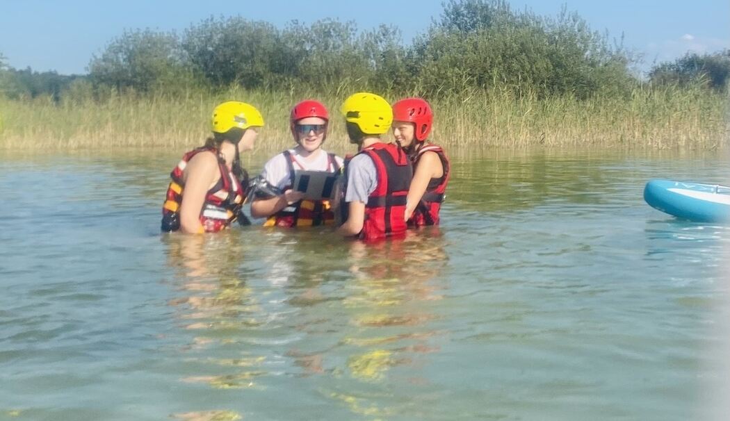 Zunächst wurden an der Wachstation die Zelte aufgebaut und die Jugendlichen mit der Wasserretterausrüstung wie Neoprenanzug und Schwimmweste eingekleidet. Nach einer kurzen Theorieeinheit zum Thema Vermisstensuche am Gewässer erfolgte auch schon der erste Übungseinsatz für die Teilnehmer.