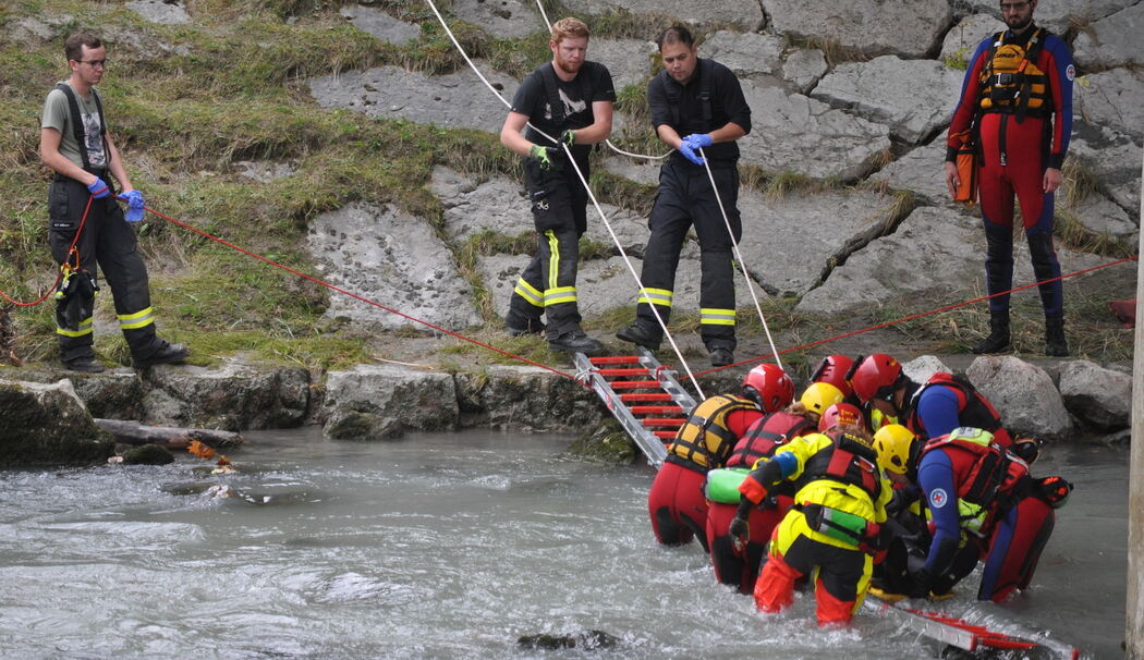 Hier riet der Einsatzbeobachter den Rettungskräften, umstehende Personen zur Betreuung heranzuziehen, damit sich die Mannschaft auf den Einsatz konzentrieren kann. Auch kommt es vor, dass ein Paragleiter abstürzt und sich in einem Baum verfängt. Für die Helfer durchaus eine Herausforderung und doch meisterten die Retter diese Aufgabe wie auch den Forstunfall mit umgestürztem Baum zuverlässig und routiniert. Zur Brandbekämpfung, eigentlich die ursprüngliche Hauptaufgabe der Feuerwehr, wurde eben-falls alarmiert. Aus einem Stadel trat Rauch aus und eine Person rief im Inneren um Hilfe, eine weitere Person lief der Feuerwehr entgegen und dann zurück zum Stadel, um die eingeschlossene Person zu befreien. Plötzlich hatte die Feuerwehr gleich zwei Menschen zu retten. Interessant war zu beobachten, wie schnell die Wehr eine Schlauchleitung aufbaute und weitere Floriansjünger mit Atemschutz nach den Personen suchten und diese retteten. Besonders spektakulär gestaltete sich der Einsatz an der Tiroler Achen. Hier wurde eine Person mit einer Trage auf einer Art Schiene aus dem Wasser gezogen.