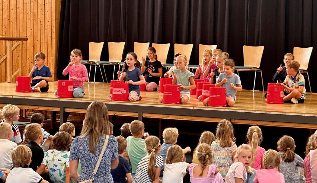 Schulleiterin Sabine Ramming hieß die gesamte Schulfamilie in der Surtalhalle willkommen, wo zunächst die Bläserklasse und einige Schulklassen Musik machten, trommelten und rappten. Die Klasse 2b zum Beispiel bot eine Eimerpercussion zu dem Song »Eiszeit«, eine Nummer kleiner, nämlich mit Bechern, trat die Klasse 4b auf. Die Klasse 1b hatte mit einem Vater ein afrikanisches Lied einstudiert