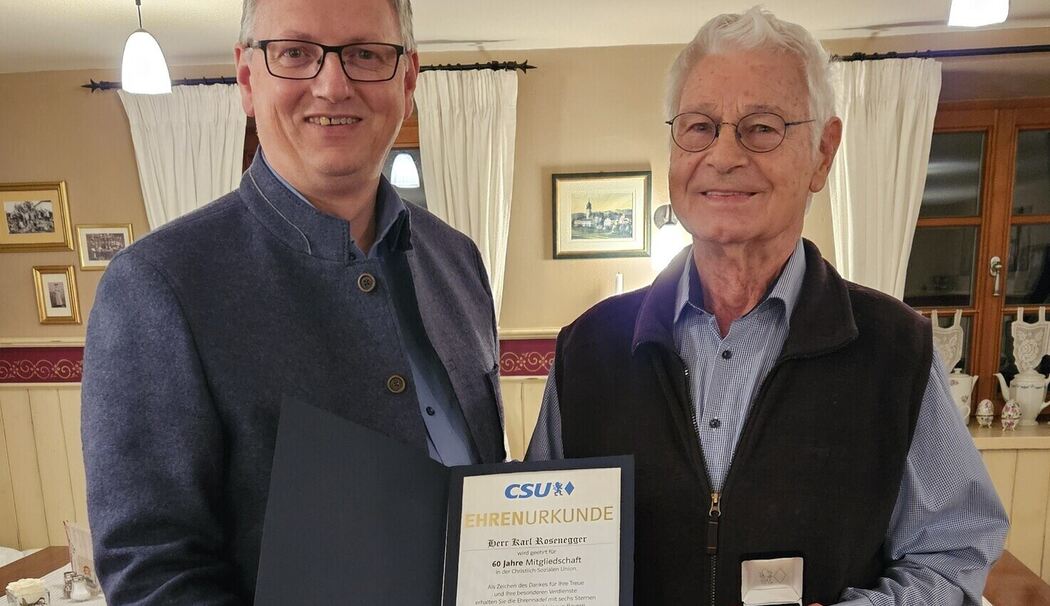 Auch eine seltene Ehrung gab es zu verkünden: Karl Rosenegger gehört nun seit 60 Jahren dem CSU-Ortsverband Surberg an. Wimmer würdigte diese außerordentliche Leistung und dankte für die langjährige Treue zur Partei. Als Dank wurde Rosenegger die Ehrennadel mit sechs Sternen der CSU verliehen.