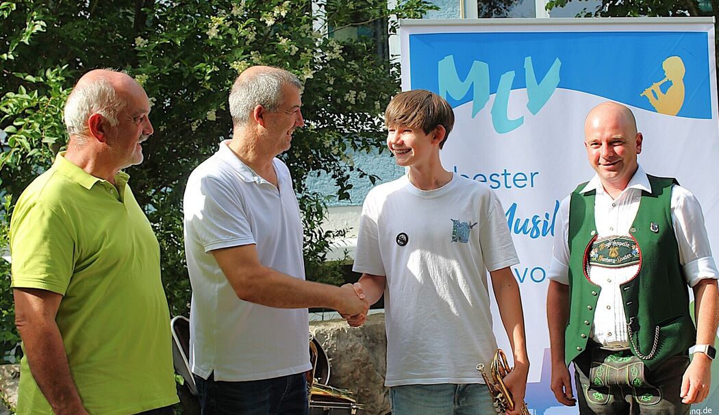 Surberg – Im Schatten der großen Kastanienbäume im Pausenhof der Grundschule Surberg fand das Sommerkonzert der Musiklehrervereinigung (MLV) für ihre Surberger Musikschüler statt. Vor vielen Eltern, Großeltern und Freunden zeigten knapp 20 Nachwuchsmusiker ihre bereits erworbenen Fähigkeiten an den jeweiligen Instrumenten. Eine Überraschung gab es für Emil Stechl: Er erhielt das Leistungsabzeichen D1 in Bronze. Standortleiter Bernhard Lackner führte durch den Konzertnachmittag. Das Programm hatte er gemeinsam mit einem siebenköpfigen, in Surberg tätigen Musiklehrerteam zusammengestellt.