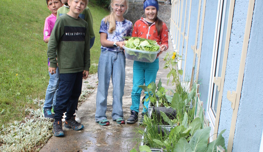 Vor acht Wochen hatte er beim »Pflanztag« mit seinen Mitschülern Bäckerkisten zu Pflanztrögen umfunktioniert und voller Eifer Salat, Kohlrabi, Radieschen sowie Ringelblumen gesät und gepflanzt. Mit Hilfe von AELF-Fachlehrerin Sieglinde Maier-Stöhr, die das Projekt seit einigen Jahren begleitet, wurden die Schüler dann angeleitet, ihre Pflanzkästen intensiv zu betreuen. Oskar hatte so viel Spaß, dass er jetzt auch zu Hause ein eigenes Beet hegt und pflegt mit Kohlrabi, Salat, Kapuzinerkresse und Gurken. »Nur die Schnecken ärgern mich sehr«, sagt er. Sabine Ramming, Schulleiterin und Klassenlehrerin, ist begeistert: »Es ist so einfach: wenig Aufwand und viel Nachhaltigkeit. Wir brauchen keinen Schulgarten oder ein Hochbeet anlegen, um die sich dann nach Schuljahresende keiner mehr kümmert.« Im Unterricht schlägt sie immer wieder Brücken zu dem Projekt und hört gerne, wie die Kinder ihr Wissen auch ans Elternhaus weitergeben. »Hier erziehen manchmal die Kinder ihre Eltern.«
