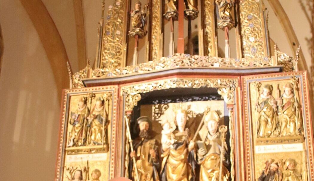 Auf der Rückseite zeigen fünf Medaillons die vier Evangelisten und das Lamm, umrahmt von den Kirchenvätern, dazu eine fehler-hafte lateinische Verszeile von 1511. Steinbacher erläuterte den Portiunkula-Ablass, der seit 1910 allen Kirchen gewährt ist, und stellte die sogenannten Kolomaniköpfe vor, in deren Öffnungen früher Gebete gegen Kopfleiden »verpflöckt« wurden; um 1900 besaß St. Coloman ein übergroßes Exemplar.