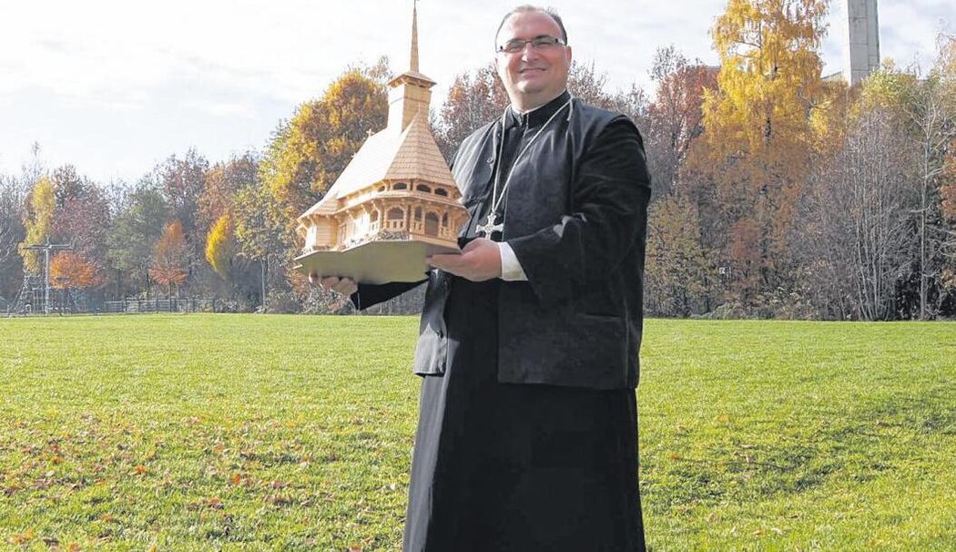 Pfarrer Constantin Bartok mit dem Modell der orthodoxen Holzkirche, die auf diesem Grundstück am Rand der Siedlung »Walchenfeld« entstehen soll. (Foto: Mix)