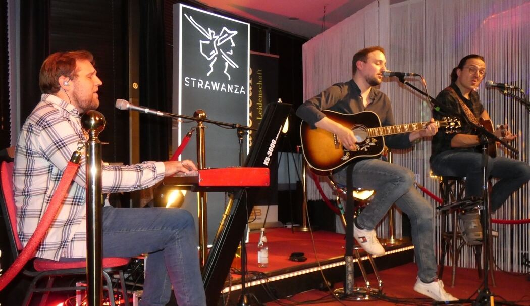 Jetzt feierte die Band »Strawanza« aus Bad Aibling im Theatercafé eine umjubelte Traunreut-Premiere. Während sie eigentlich als sechsköpfige Formation auf der Bühne stehen, gaben Lead-Sänger und Gitarrist Tobias Neumeyer, Sänger und Keyboarder Sebastian Neumeyer und Sänger und Gitarrist Michael Reitberger ihre mitreißenden, selbst geschriebenen Mundart-Songs wie »Do wo i wui«, »Jung und wuid«,