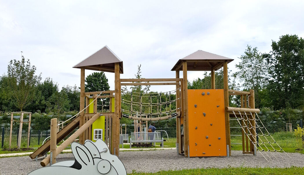 Die erste Spielkombination, die besonders für kleinere Kinder gedacht ist mit einem Pfahlhaus und einer Plattform mit Sand-Spielausrüstung sowie einer kleinen Rutschbahn. Eine große Vogelnestschaukel mit Platz für mehrere Kinder, ein Sitzplatz mit Tisch und zwei Federwippen säumen den Weg zur großen Spielkombination mit zwei Türmen, Seilbrücke, Tarzanbrücke, Kletterwand, schrägem Steigstamm, Rutschbahn und einer Podesthöhe von 1,50 Metern. Dieser Bereich dürfte vor allem für die größeren Kinder bis zwölf Jahre spannend sein. Ein weiterer Höhepunkt ist die rollstuhlgeeignete Wippe, auf der auch mehrere Kinder gleichzeitig wippen können. Wer noch mehr Bewegung möchte, kann sich auf dem Stehkarussell drehen und anschließend an einer Stangen-Federwippe seine Balance üben.