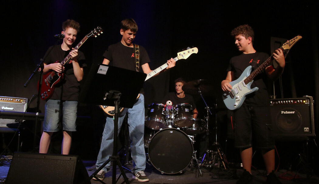 Den Anfang machten Matilda Riehm, Julia Kreipl und Mila Weber, drei junge Gitarristinnen. Mila Weber spielte sogar zwei selbst komponierte Stücke. Weiter ging es mit Linus Reuther, Patrick Gaceanu und Fabian Felder, die mit Unterstützung von Justus Reuter und Julian Ramstötter energiegeladen zeigten, was sie draufhaben. Dann sorgten »Mystery Machine« – Hannes Aigenherr, Justus Reuter, Julian Ramstötter und Florian Lahr – für Stimmung. Leisere Töne mit dem Klassiker »Heart of Gold« sang Emma Aichhorn, begleitet an den Gitarren von Matthias Zhang und Amber Sturmat, Sophia Diener am Schlagzeug sowie Ari Eder am Bass.