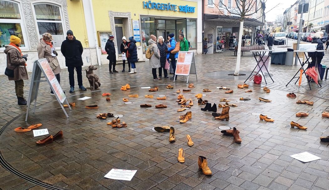 Je ein Paar stand symbolisch für zehn Opfer im Jahr 2024 im Landkreis Traunstein – die Aktion des Soroptimist Club (SI-Clubs) lief am Samstagvormittag im Rahmen der internationalen »Orange Days«, um auf das Problem der so vielerorts im Steigen begriffenen häuslichen Gewalt aufmerksam zu machen: 376 weibliche Opfer von sexualisierter Gewalt gab es 2024 allein im Landkreis Traunstein. Im