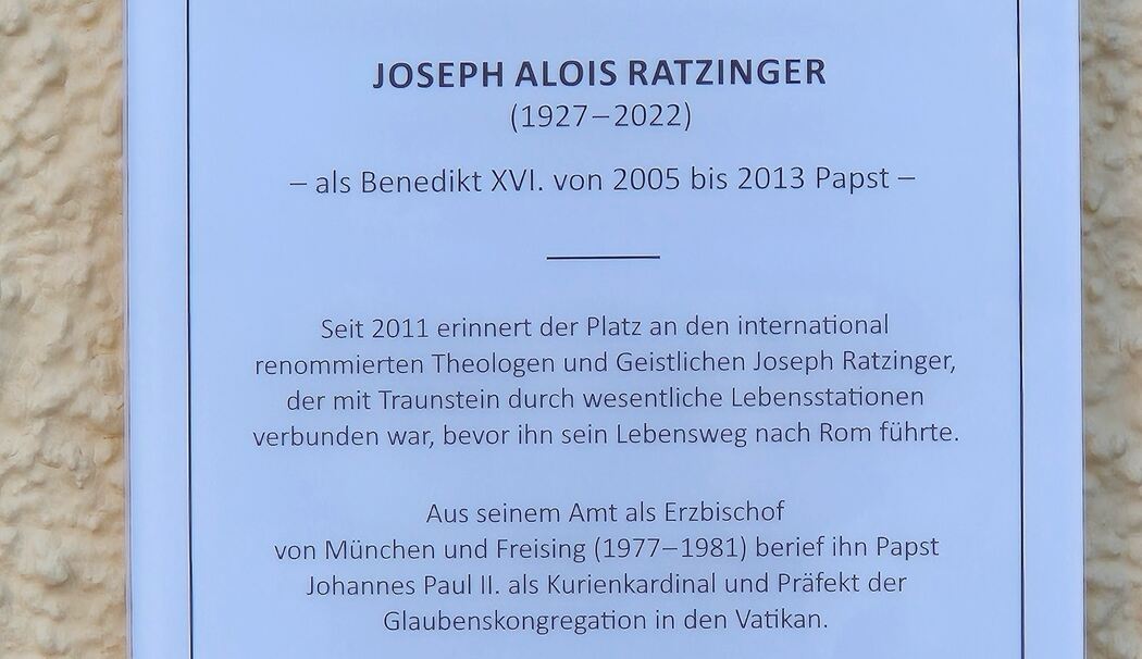 Traunstein – Die Verwaltung im Landratsamt hat die Beschilderung auf dem Papst-Benedikt-XVI.-Platz und am angrenzenden Denkmal für Turnvater Jahn abgeschlossen. In den vergangen Wochen hat sie zum einen zwei neue Kontextualisierungstafeln angebracht, die Informationen über Papst Benedikt XVI. und Turnvater Jahn enthalten. Und zuletzt haben die Mitarbeiter nun auch das alte Straßenschild »Papst-Benedikt-XVI.-Platz« aufgehängt, das sie vor der Sanierung des Platzes abgehängt hatten.