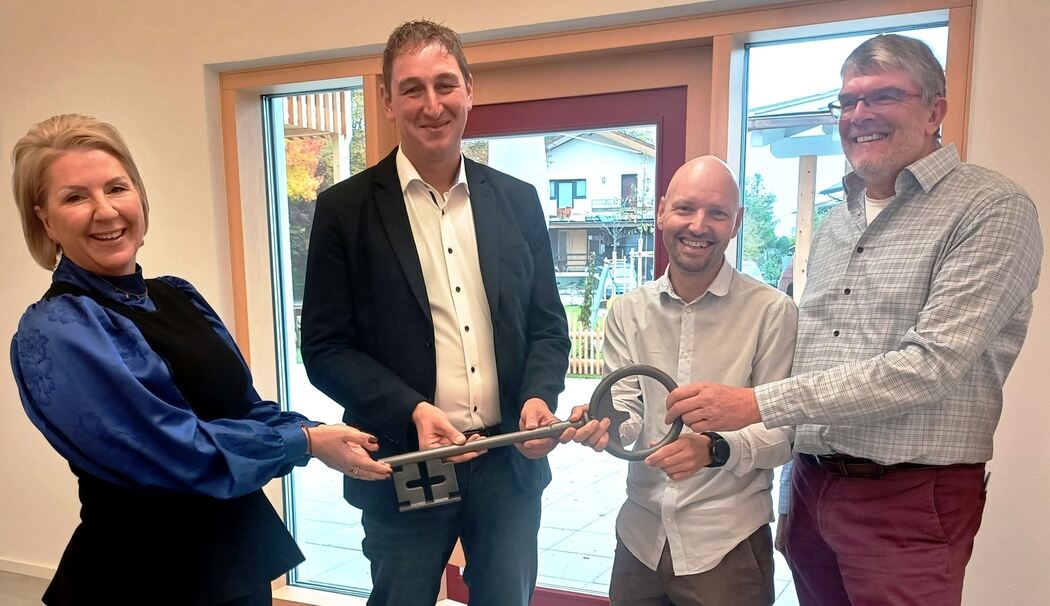 Übersee – Nach fast vier Jahren Planungs- und Bauzeit wurde der erweiterte und rundum erneuerte Kindergarten und die Kinderkrippe am Zellerpark mit allen Beteiligten feierlich eingeweiht. Die Kinder und Besucher erwartet jetzt ein heller, zweistöckiger Bau in Hybridbauweise aus Beton und Massivholz mit Satteldach, auf dem eine Photovoltaikanlage angebracht ist.