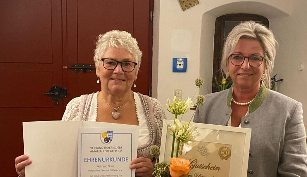 Ein besonderes Ereignis bei der Versammlung war die Ehrung der Vorsitzenden Waltraud Gries für ihre 50-jährige Mitgliedschaft im Theaterverein. Gries begann 1972 als Souffleuse im Verein, bevor sie dann auf die Bühne wechselte. Seit 1974 war sie auch Schriftführerin und seit 2000 ist sie Vorsitzende. Nach wie vor ist Gries aktive Spielerin mit Leib und Seele. Als Überraschung hatte die Theaterfamilie für ihre Chefin eine Foto- und Filmvorführung mit Spielszenen und Erinnerungen aus ihrer 50-jährigen Vereinszugehörigkeit vorbereitet.