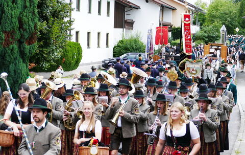 Bereits in den frühen Morgenstunden waren die Mitglieder der Böllerschützen „zum Aufwecken“ im Einsatz. Vor dem Kirchzug, der vom Festzelt an der Straße nach Waging bis zum Freiluftaltar führte, wurden die Kapellen in insgesamt neun Züge zusammengestellt. Pünktlich um 9.30 Uhr marschierten alle gemeinsam in Richtung Kirche los. Auf der Wiese neben der Straße in Richtung Kammer wurde der Feldgottesdienst abgehalten.