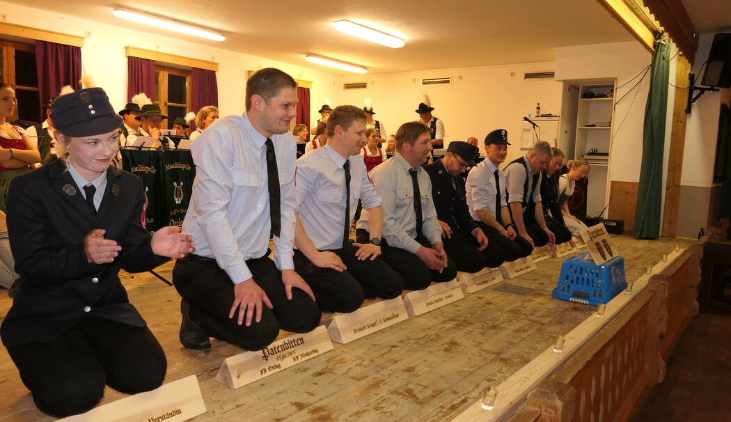 Waging am See – Schmerzende Knie und 180 Liter Freibier waren das Ergebnis beim Patenbitten der Ottinger Freiwilligen Feuerwehr beim Wirt in Otting. Damit steht fest: Die Nirnhartinger Wehr übernimmt im August die Patenschaft für das 150. Gründungsfest der Ottinger Feuerwehr. Bis es jedoch zu einer endgültigen Zusage kam, mussten die Ottinger einige Prüfungen ablegen. Zur Auflockerung des Abend trug die Blaskapelle Otting mit flotten Klängen bei.