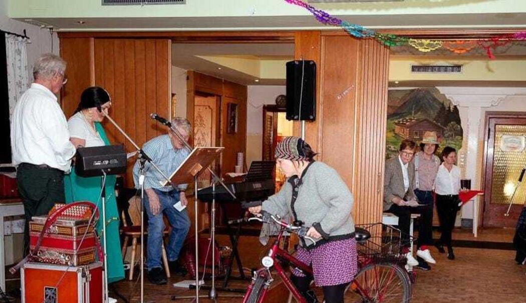 Die Jungfrau im Walde im letzten Sketch brauchte Luft im hinteren Fahrradreifen. Der dazugekommene Junggeselle reparierte das Vehikel zwar, aber nur, um es dann als Gegenleistung mitzunehmen. Denn, so verkündete er, a neis Radl könne er sowieso brauchen. Die Musikanten Schorsch und Heini spielten mit der Gitarre und der Ziach gekonnt auf, sangen gesellige Lieder und brachten lustige Geschichten und einige Witze zum Besten.