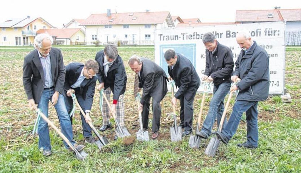 Gutes Gelingen wünschte Bürgermeister Franz Parzinger der Baumaßnahme beim symbolischen ersten Spatenstich mit den Vertretern der Stadt und der ausführenden Firmen. Planer Robert Fendt geht fest davon aus, dass die Erschließungsarbeiten (Kanal, Wasser, Straßen) des Neubaugebietes Frauenbrunn II, das die komplette Fläche bis hin zum neuen Kreisverkehr einschließt, bis Mitte September abgeschlossen sind. So könnte noch im Herbst mit dem Bau der ersten Häuser – es sind ausschließlich Einzelhäuser möglich – begonnen werden. Nach Angaben der Stadtverwaltung können sich die Bauwilligen aber erst im Juni für ein Grundstück bei der Stadt Traunreut bewerben. Der genaue Termin für die Vergabe der Bewerbungsunterlagen und der Exposés werde noch bekannt gegeben. Über die Grundstückspreise wurden keine Angaben gemacht.