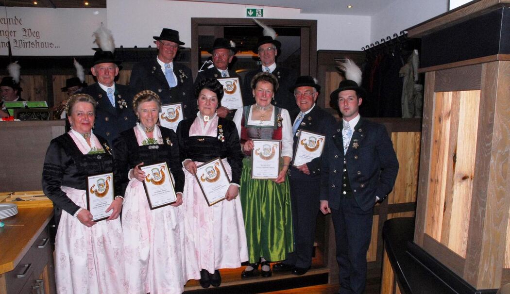 Unglaubliche 80 Jahre im Verein ist Loni Daburger, die leider nicht persönlich anwesend sein konnte. Für 70 Jahre engagierte Vereinszugehörigkeit erhielt Hermann Berger neben dem Präsent des Vereins auch einen Ehrenkrug des Gauverbands von Gebietsvertreter Alfred Gehmacher. Dieser übergab auch für je 50-jährige Mitgliedschaft und besondere Verdienste um den Trachtenverein das Goldene Gauehrenzeichen an Elisabeth Forstmaier, Elisabeth Freimoser, Annette Nieder, Ilse Purzeller, Rudi Haberlander, Jakob Schmaus, Ignaz Schneider und Engelbert Schweiger.