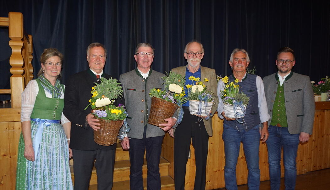 Mit je einem Blumenpräsent geehrt wurden die ausgeschiedenen bisherigen Kassenprüfer Hans Wastlhuber (28 Jahre im Kreisverband) und Hans Bernauer (16 Jahre im KV), 2. Vorstand Sepp Mörwald, Altenmarkt (24 Jahre im KV), Kassier Georg Unterhauser (44 Jahre im KV).