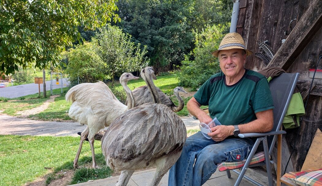 Toni Maier wirft eine Hand voll Körner auf den Boden und schon flattern gurrend Tauben herbei, Hühner picken gackernd nach dem Futter und Enten fordern schnatternd ihren Anteil. Ein buntes Bild für Augen und Ohren von allerlei Federtieren verschiedenster Art. Dann schiebt sich still ein langer Hals in das bunte Treiben, der so gar nicht nach bayerischem Dorfleben aussieht. Ein Nandu pickt ebenfalls nach den Körnern. Und spätestens als ein Känguru vorbei hüpft, ist sich der Besucher sicher, nicht bei Toni Maier in Vachenlueg, sondern im Tierpark gelandet zu sein. »Es ist mein kleines Paradies«, sagt der 66-Jährige lachend und wirft seinen Lieblingen die nächste Hand voll Körner zu.