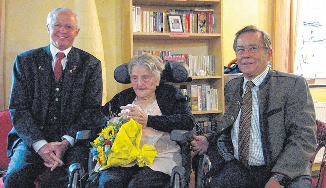Maria Noichl feierte am Dienstag im Senioren- und Pflegeheim Unterwössen ihren 100. Geburtstag. Zu den Gratulanten gehörten auch stellvertretender Landrat Georg Klausner (links) und Bürgermeister Hans Haslreiter. Klausner übermittelte auch Grüße von Ministerpräsident Horst Seehofer. Maria Noichl hat zeitlebens gern gearbeitet und so hat ihr das Leben auch viel Arbeit gebracht. Sie ist in Kössen geboren und war viele Jahre Magd in Mietenkam. Aus dieser Zeit stammt ihre Liebe zu den Tieren. Nach ihrer Heirat bekam sie zwei Söhne. Ihr Hobby ist die Musik, allem voran die Volks- und Marschmusik. (Foto: Flug)