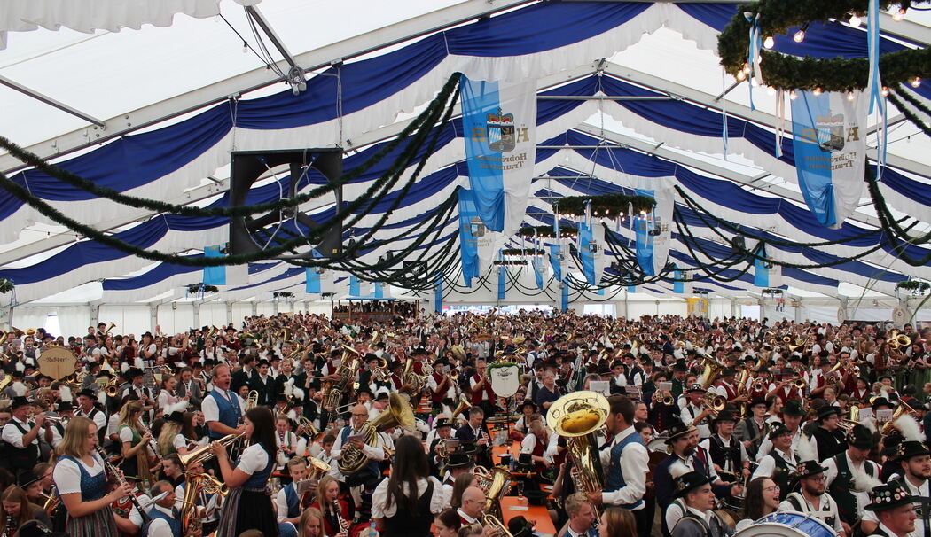 Bei Nieselregen fand zunächst der Festgottesdienst im großen Festzelt statt. Pfarrer Ludwig Westermaier fand in seiner Predigt treffende Worte und bekam dafür Applaus der mehreren tausend Anwesenden. Nach der gemeinsam gesungenen Bayernhymne machten sich die 54 Musikkapellen aus Bayern, Österreich und Italien mit den Ortsvereinen, Ehrengästen und Festkutschen auf zum farbenprächtigen Umzug. Tausende Zuschauer säumten, nachdem der Regen aufgehört hatte, die Straßen zwischen dem Ortsteil Strohhof und Fridolfing und spendeten reichlich Applaus.