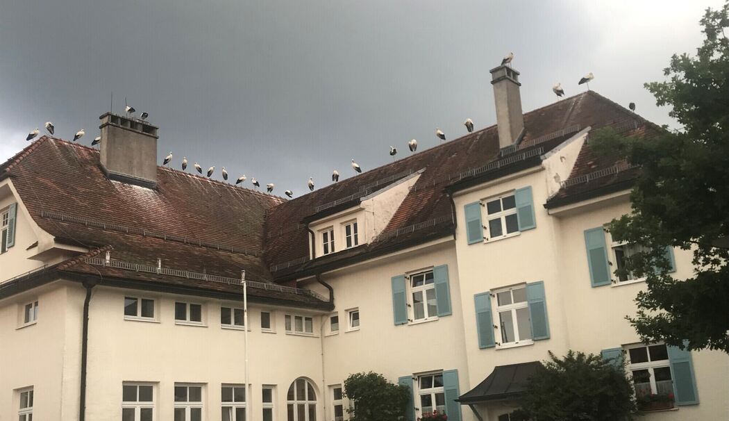 Am Sonntagabend versammelten sich nach Angaben der Anwohner Peter und Claudia Stein bis zu 40 Störche auf den Dächern des alten Schulhauses, der Sparkasse und der Pfarrkirche St. Maximilian und verbrachten dort die Nacht. Vermutlich werden die Störche zeitnah ihre Reise in ihr Winterquartier antreten. mmü
