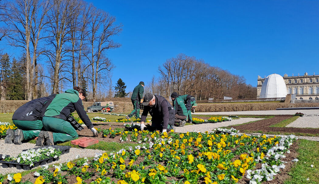 Jedes Jahr werden farblich neue Akzente gesetzt. Heuer ist die Farbgebung mit Stiefmütterchen der Sorten »Viola wittrockiana Panola – Inspire Scarlett, Yellow & White« in Gelb-rot-Tönen gehalten. Im unteren Parterre des Neuen Schlosses erblüht ein Farbenspiel in Gelb, Rot und Weiß mit gezielt roten Akzenten durch Tulpen und orange-gelbe Erysimum (Goldlack) sowie Narzissen »Bridal Crown« und »Gold Medal«.