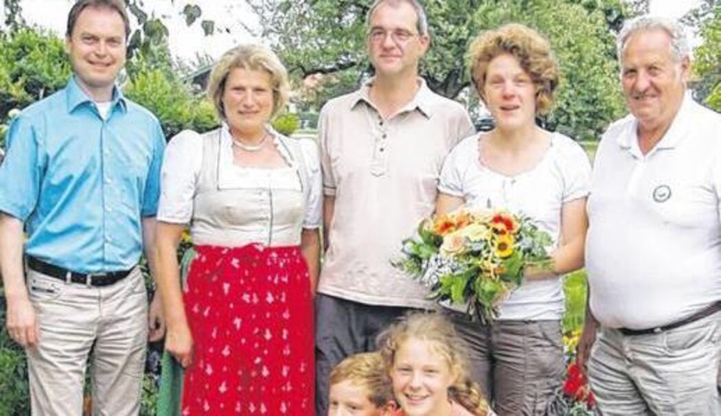 Chieming. Zum 40. Mal hat Kathrin Jud aus Neunkirchen im Siegerland Urlaub in der Gemeinde Chieming gemacht. Im Alter von vier Jahren reiste sie erstmals mit ihren Eltern zur Familie Immerz und seit vielen Jahren kommt sie mit Ehemann Stefan und den Kindern Pia und Leo angereist. Verkehrsvereinsvorsitzender Max Brunner ehrte die Jubilarin zusammen mit Chiemings Touristikleiter Christian Fitzner für ihre vier Jahrzehnte lange Treue mit Geschenken und steckte ihr die Ehrennadel des Verkehrsvereins an. Frau Jud bedauerte, dass der alljährliche Urlaub meist zu schnell vergeht. Besonders gerne erinnert sie sich an die gemeinsamen Abende mit der Familie Immerz. OH