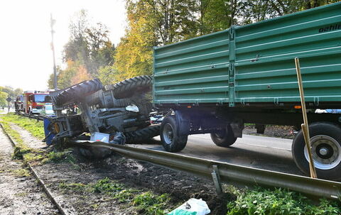 Nachdem er mit der Zugmaschine zu stark gegenlenkte, wurde der Traktor vom Gewicht des Anhängers ausgehebelt und kippte seitlich um. Der Traktor rutschte auf die Gegenfahrbahn und kam dort über der Leitplanke seitlich zum Liegen.