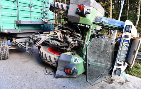 Der Traktor stürzte um. Bei dem Unfall wurde der Fahrer leicht verletzt und vom BRK in das nächste Krankenhaus gebracht. Die Feuerwehren Rabenden, Altenmarkt und Alzmetall mussten den Verkehr um die Unfallstelle einspurig umleiten und diese anschließend säubern. Die Polizei Trostberg nahm den Unfall auf.