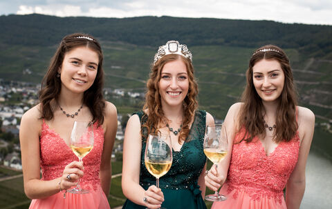 Die Weinhoheiten von Piesport an der Mosel bestehen aus Weinkönigin Franziska I. (Mitte) mit ihren Weinprinzessinnen Viktoria (rechts) und Katharina (links). Sie vertreten bis ...