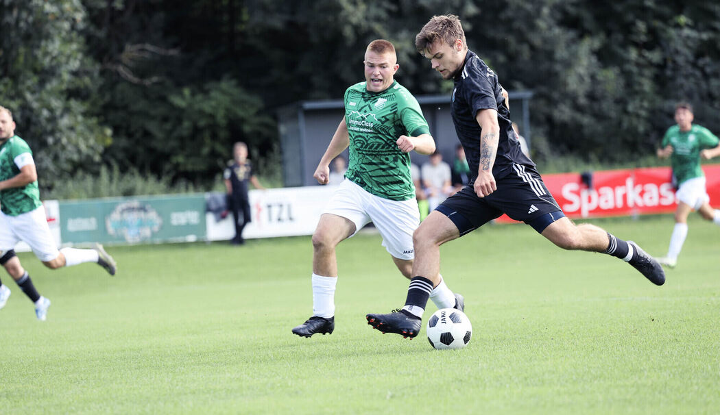 Pallings Deniz Burnuc (rechts, hier im Duell mit dem Kraiburger Sebastian Spitlbauer) brachte in dieser Szene seine Farben mit 1:0 in Führung. Am Ende musste der TSV mit einer 1:2-Niederlage im Gepäck wieder die Heimreise antreten. (Foto: Mühlhofer)
