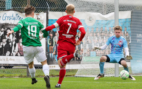 Die Hausherren befreiten sich nur langsam. Sie kamen erst in der 35. Minute zu ihrer ersten Chance: Ein langer Abschlag erreichte Galanek, der es aus 20 m halblinks mit einem Lupfer über den herauseilenden Gästetorwart versuchte, aber an diesem scheiterte. Dennoch blieb der TSV dran und ging etwas überraschend mit 1:0 in Führung. Samuel Anthuber erkämpfte sich das Leder und sah, dass Ebersbergs Schlussmann Schmidmaier etwas zu weit vor seinem Kasten stand – er überlupfte diesen aus gut 40 Metern. Doch der Jubel hielt nicht lange. Als eine Chance schon geklärt schien, erwischte eine Hereingabe von rechts Liam Grill auf dem falschen Fuß und der Ball rutschte unglücklich ins eigene Tor (38.).