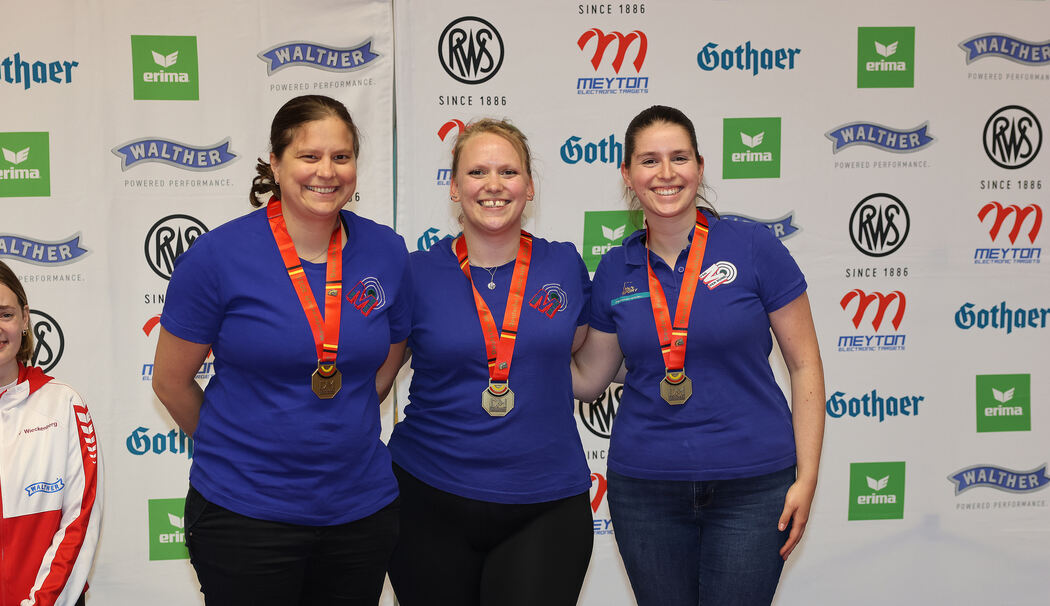 Für die Teamwertung wurden die Einzelergebnisse zusammengezählt – und da reichte es für die FSG Der Bund Allach für einen Podestplatz! Silvia Rosner freute sich zusammen mit Kerstin Obermaier (23. Platz in der Qualifikation) und der Deutschen Einzel-Meisterin Isabella Straub über den dritten Rang mit 1752 Gesamtringen. Besser waren nur das Team SV Wieckenberg I (1758 Gesamtringe) und der SV Mannheim Rheinau (1756).
