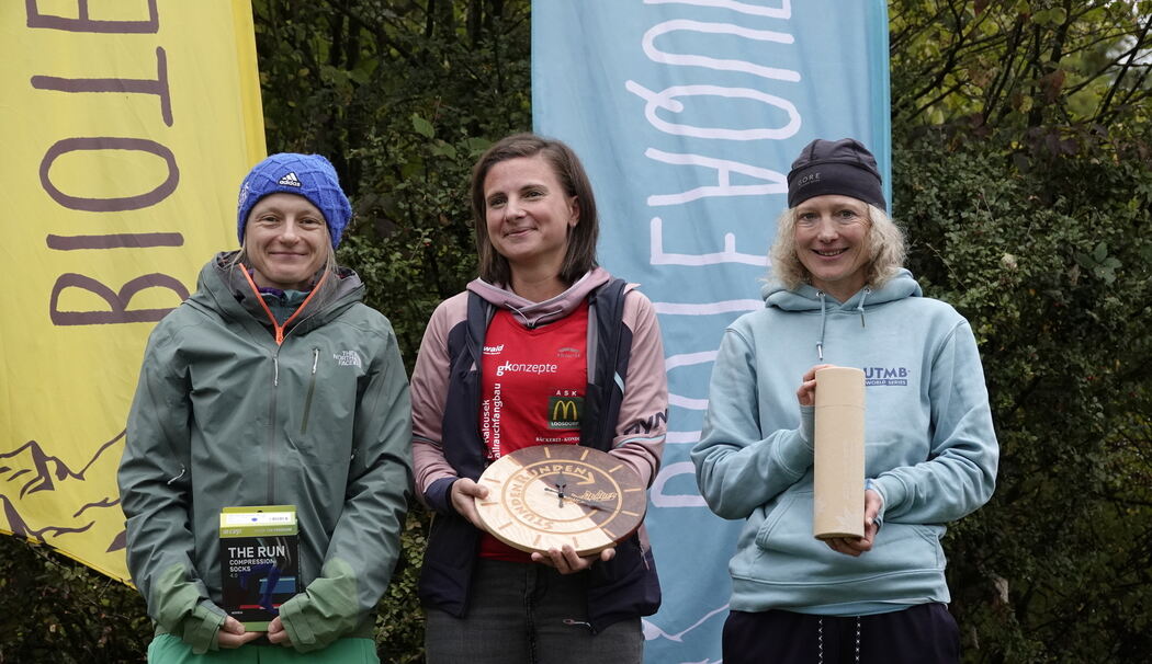 »Die 100 km, also 15 Runden, und die 24 Runden mit 100 Meilen sind für uns natürlich ganz besondere Distanzen. Daher haben wir uns entschieden, sie bei der Siegerehrung besonders zu prämieren«, erläuterte Alois Klauser. Am Ende standen dann Veronika Heidreich(1. Platz in 14:40:02 Stunden) und Veronika John (2. Platz in 14:43:03) vom SC Anger auf dem Podest als weibliche 100,5-km Finisherinnen. Bei den Herren gewann Joey Dohle vom TSV Chieming Triathlon (1. Platz in 14:32:40) vor Henry Zorn (2. in 14:34:03) und Tobias Hürter (3. in 14:38:01). Für die Platzierung wurde lediglich die Zeit der letzten Runde gewertet, alle anderen Runden zuvor wurden einheitlich mit einer Stunde gerechnet, was damit nicht der Netto-Laufzeit entspricht.