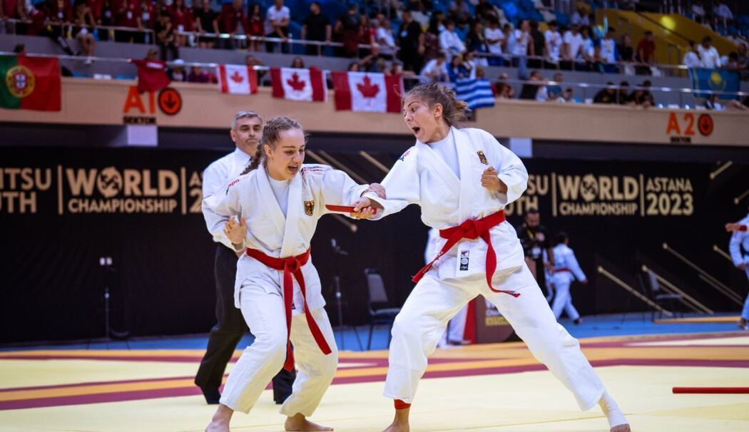 Im Anschluss an die Vorrundenkämpfe folgte eine bunte und stimmungsvolle Eröffnungsfeier mit kasachischer Musik, Gesang und einer beeindrucken folkloristischen Tanzgruppe in bunten und traditionellen Gewändern. Danach ging es um den WM-Titel! Hier zeigte nun das harte Konditionstraining sowie die mentale Stärke der deutschen Athletinnen ihre Wirkung. In einem kämpferischen und technisch hochwertigen Finalkampf setzten sich Nigl/Koch-Sappl unter den Anfeuerungsrufen der mitgereisten Fans und Teamkollegen überlegen und überaus verdient mit 180: 175 Punkten gegen das griechische Team durch.