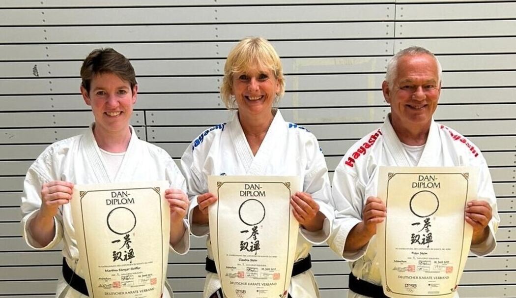 Trotz schweißtreibender Temperaturen hatten sie vor den Prüfern des Deutschen Karate Verbandes (DKV) überzeugende Leistungen gezeigt und sich selbst für ihre Mühen in der Vorbereitung belohnt. Claudia Stein, die auch Karatetrainerin beim TSV Grabenstätt ist, absolvierte die Prüfung zum 3. Dan erfolgreich und ihr Ehemann Peter Stein sowie Martina Sänger-Seiffer erreichten den 2. Dan.