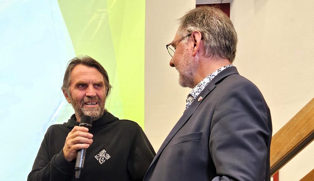 Im Gespräch mit Bürgermeister Thomas Gasser gab Thomas Huber von den Huaba-Buam Einblicke in seine sportliche Karriere und sein Privatleben. Wie man ihn bezeichnen solle, als Extremkletterer oder Extremsportler, und ob es für ihn in der Region noch sportliche Herausforderungen gäbe, fragte der Rathauschef. Er sei Bergsteiger und Abenteurer, so die Antwort, und mit dem Alter, er sei jetzt 58 Jahre alt, werden viele Routen, die man früher spielend gemeistert habe, zu einer Herausforderung. Das Abenteuer sei für ihn im Karakorum, da sei er in diesem Sommer wieder für zwei Monate. Was der Reiz dieser extremen Herausforderungen sei, die oft völlig am Limit lägen, fragte Gasser und erwähnte unter anderem das »Speed-Klettern« oder das Fallschirmspringen mit dem Basejump, das Thomas Huber auch praktiziert hat. Sei es der Wettbewerb mit sich selber oder mit seinem Bruder Alexander? Weder noch, antwortete Huber. »Du bereitest dich immer darauf vor, das Beste zu erreichen. Es geht vor allem um die mentale Vorbereitung. Wenn du dann soweit bist, machst du die Tür auf, hörst auf zu denken und bist nur noch im Tunnel. Dann kommen dir die schwersten Routen problemlos und locker vor«, so Huber.