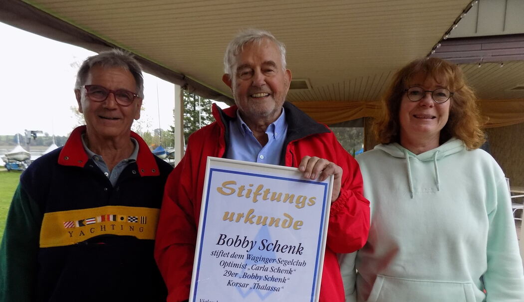 Bei diesem Gespräch gab er auch schon die Namen der gestifteten Boote bekannt, die Teil seiner persönlichen Lebensgeschichte sind: »Bobby«, »Carla« und »Thalassa«. Mit diesen Namen würdigt der Verein also nicht nur die seglerischen Leistungen von Bobby Schenk und seiner bereits verstorbenen Frau Carla Schenk, die ebenfalls Ehrenmitglied im WSC war, vielmehr verweist er damit auch auf die Liebe zur See und die Segelabenteuer des Spenders. Der Vorsitzende des WSC, Elmar Schwarz, ließ wissen, dass man die neuen Boote im kommenden Mai beim Ansegeln taufen lasse.