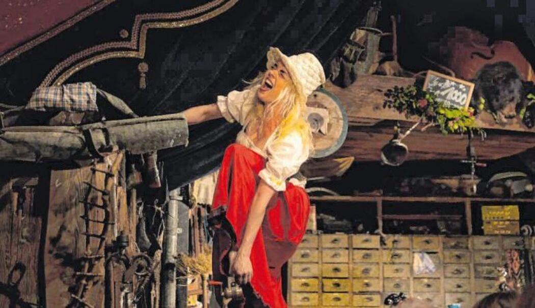 Pediküre der besonderen Art: Maria an der »Nagelfeilmaschine« ihres Vaters, eine der irrwitzigen Gerätschaften im »Himmegugga«-Theater. (Foto: Kewitsch)