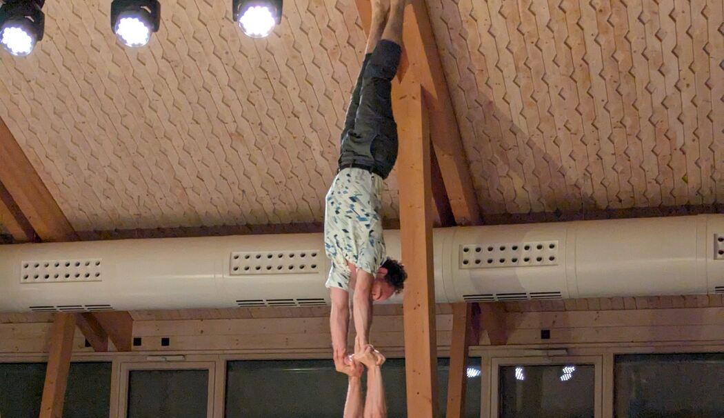 Bischofswiesen – Eine Deutschlandpremiere gab es im »Kulturhof Stanggass«: Die »Compagnie Gaïus«, kurz »Cie Gaïus«, bestehend aus den Artisten Julius Bitterling und César Mispelon, präsentierte ihr selbst entwickeltes Stück »PAN!«. Der Festsaal im Kulturhof war im Rechteck um die Bühnenfläche bestuhlt – die Nähe zum Publikum war den Künstlern wichtig. Bitterling, der aus Marktschellenberg stammt und nach sechs Jahren Ausbildung in Frankreich, China und Kanada 2017 an der »National Circus School« in Montreal abschloss, und Mispelon sind seit 15 Jahren Akrobatikpartner.