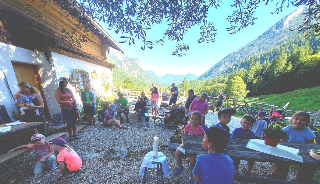 Der Weg führte in mehreren Stationen zur Alm. An jeder Station war ein anderer Sinn gefragt. Sehen – mit selbst gebastelten Fernrohren konnten die Kinder und Erwachsenen die Umgebung und Berge genau betrachten. Fühlen – Gras und Baumrinde erinnerten daran, wie vielfältig sich die Schöpfung anfühlt, wenn sie bewusst berührt wird. Hören – Kuhglocken, Vogelgezwitscher, die Stimmen von Wanderern in der Ferne und vor allem die Stille selbst öffneten das Ohr für Gottes Schöpfung. Riechen – die frische Bergluft, das Wasser und die Blumenwiesen ließen tief durchatmen. Schmecken – auf der Ragertalm wartete schließlich eine wohlverdiente Brotzeit, die allen besonders gut schmeckte.